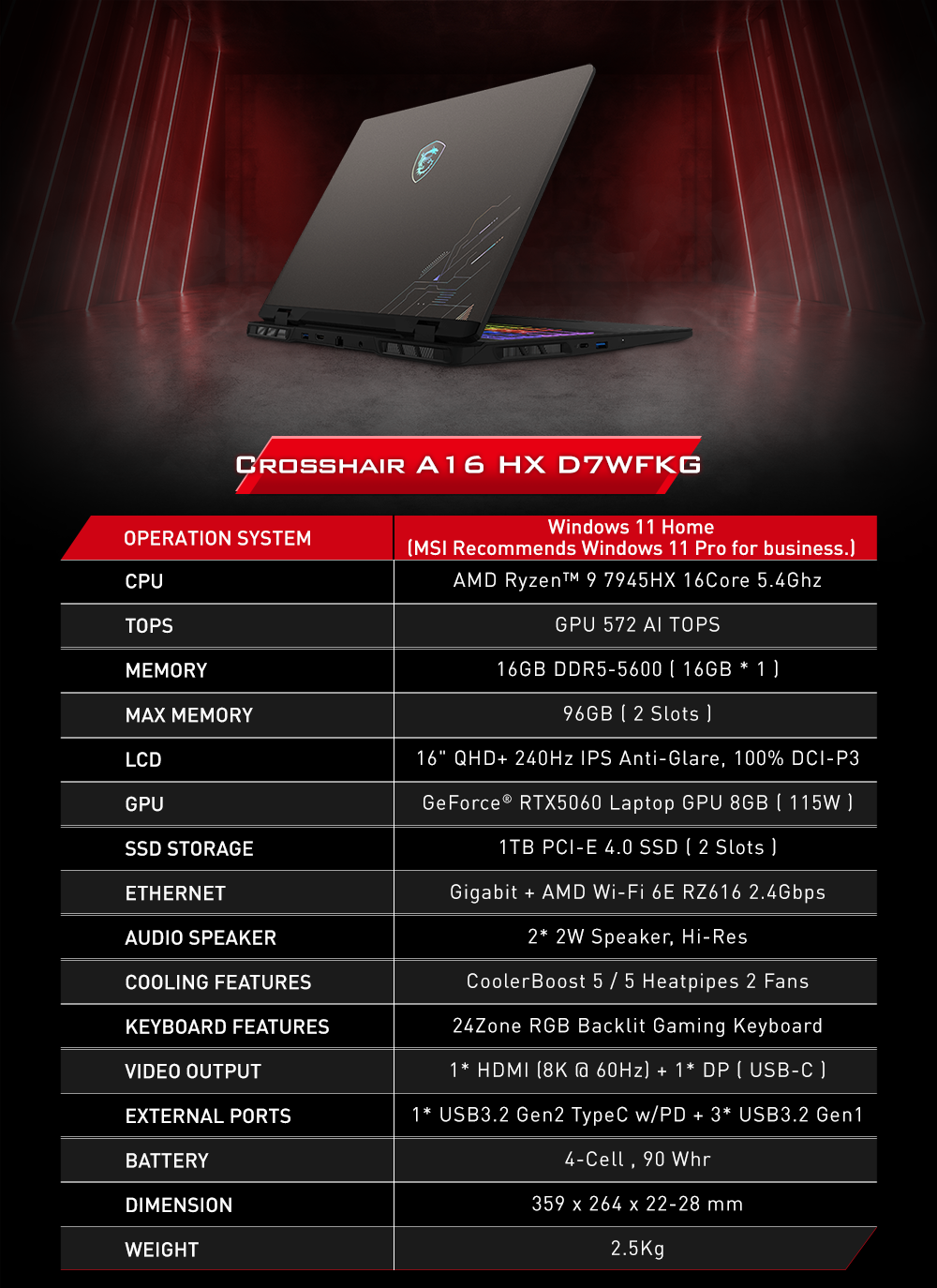 ▸ CPU: AMD Ryzen™ 9 7945HX 16Cores 32Threads Up to 5.4Ghz