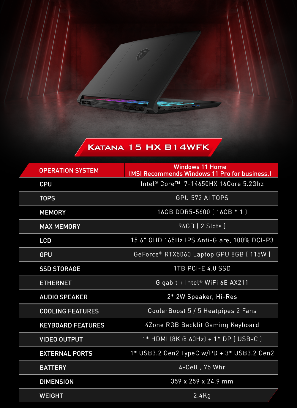 ▸ CPU: Intel® Core™ i7-14650HX 16Cores 24Threads Up to 5.2Ghz