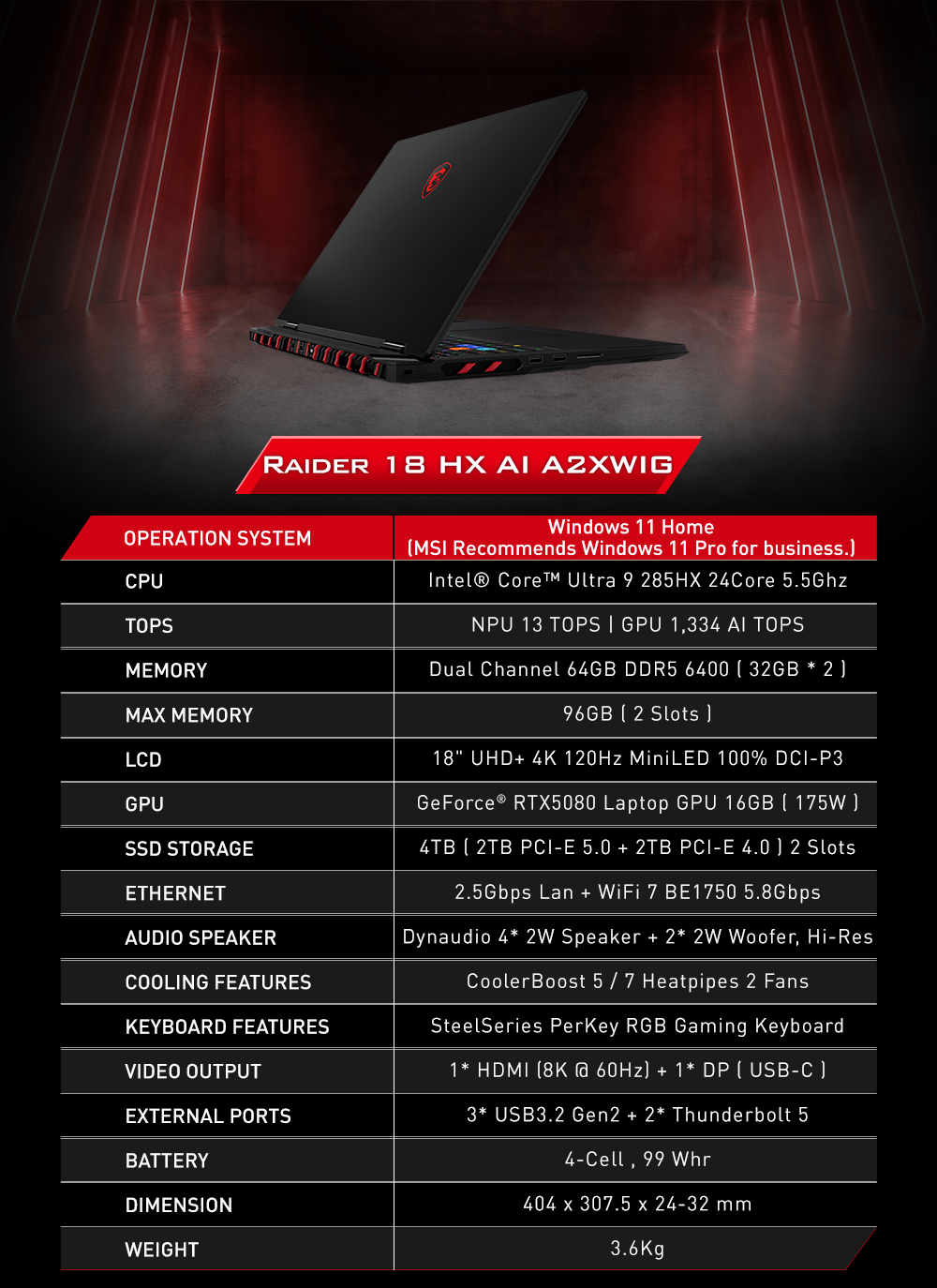 ▸ CPU: Intel® Core™ Ultra 9 285HX 24Cores Up to 5.5Ghz NPU 13TOPS