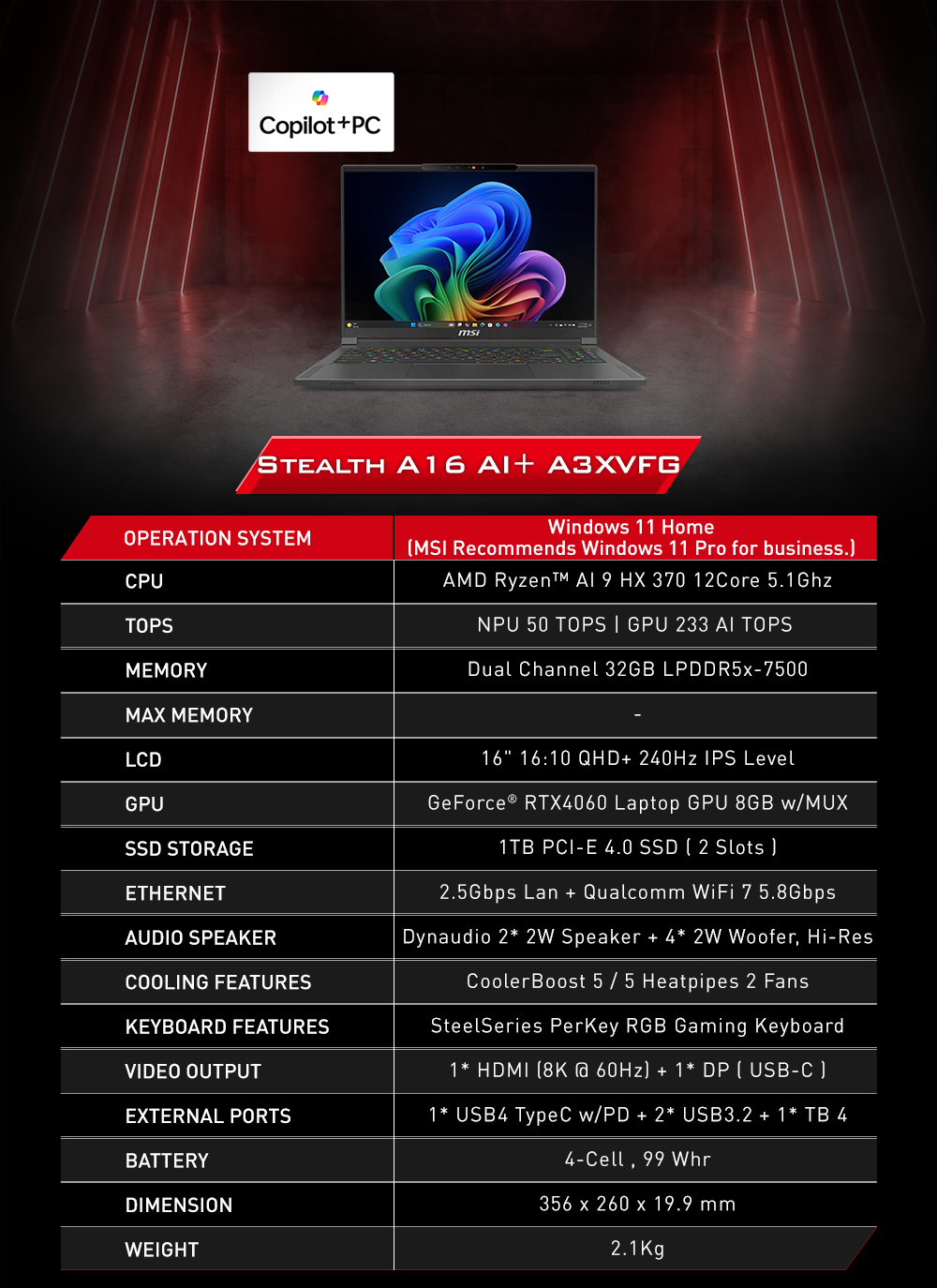 ▸ CPU: AMD Ryzen™ AI 9 HX 370 12Cores 24Threads Up to 5.1Ghz