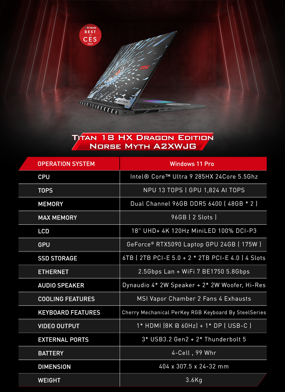 ▸ CPU: Intel® Core™ Ultra 9 285HX 24Cores Up to 5.5Ghz NPU 13TOPS